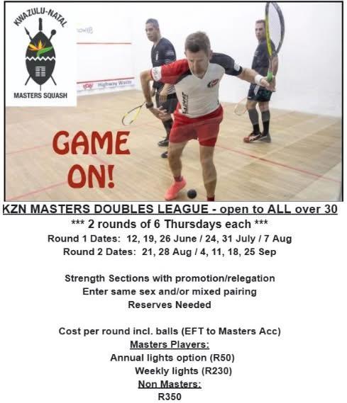Calling all squash players over 30! The KZN Masters Doubles League is back and open to ALL players 30+. Whether you’re keen on same-sex or mixed pairings, this is your chance to get involved in a fun, competitive league with promotion and relegation between strength sections.